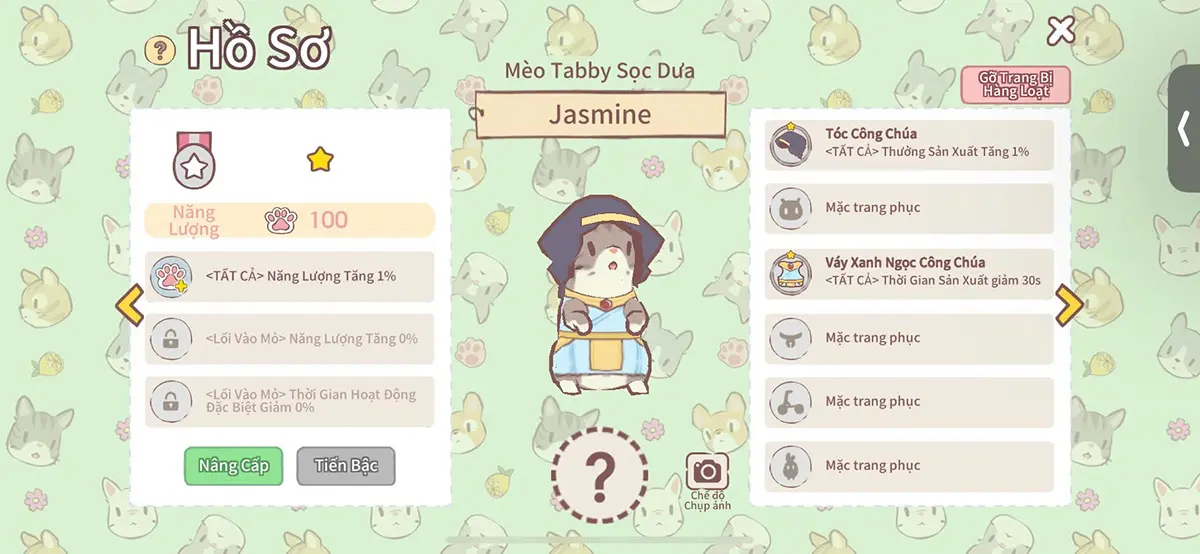 Bộ trang phục Genie tái hiện hình ảnh hoàng tử, công chúa và thần đèn thông qua phong cách tạo hình dễ thương đặc trưng của Cats & Soup: Fluffy Town. Gam màu vàng và xanh ngọc chủ đạo, kết hợp các chi tiết như đèn thần và thảm bay, tạo nên không gian huyền bí nhưng vẫn mang cảm giác nhẹ nhàng, thư giãn cho người chơi.