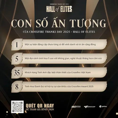 Theo công bố ban đầu, Crossfire Thanks Day 2025 – Hall of Elites sẽ được tổ chức với quy mô nâng cấp, hướng tới trải nghiệm trang trọng đẳng cấp 5 sao: